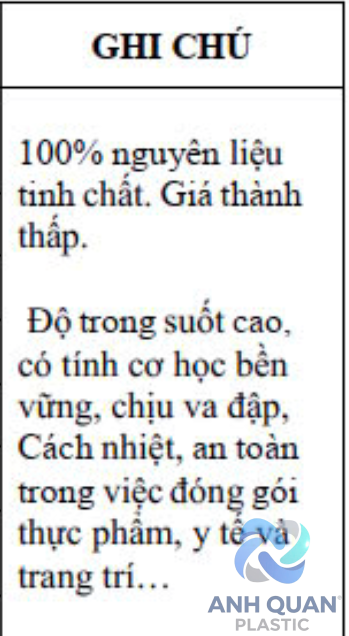 ĐỘ TRONG SUỐT CAO , CÓ TÍNH CƠ HỌC BỀN VỮNG , CHỊU VA ĐẬP , CÁCH NHIỆT , AN TOÀN TRONG VIỆC ĐÓNG GÓI THỰC PHẨM , Y TẾ VÀ TRANG TRÍ